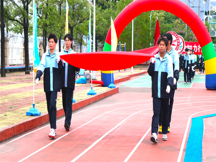 “一二一!一二一!”激昂的口號劃破晴空,國旗隊與校旗隊邁著擲地有聲的步伐率先入場。隊員們身姿挺拔如松,眼神堅定如炬,鮮紅的國旗與校旗在風中獵獵飄揚,不僅彰顯著云揚人對黨和國家的忠誠,更承載著“逐夢青春”的初心與擔當——這是開幕式最莊嚴的序章,也是信仰與榮耀的傳承。